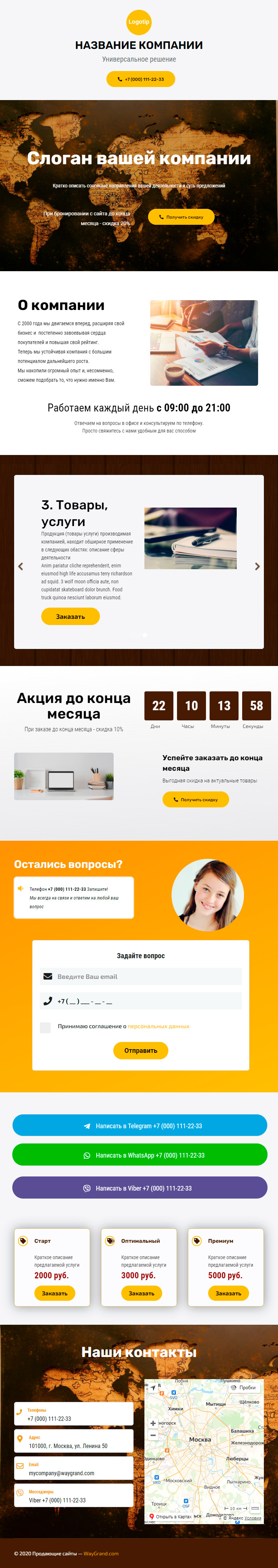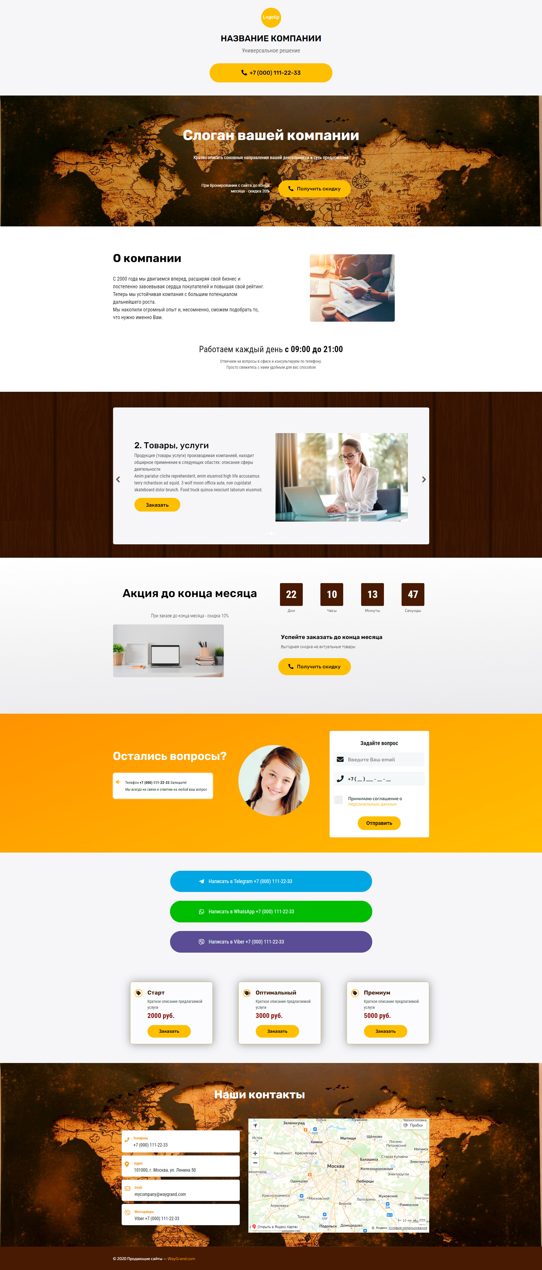 - Промоблок "Слоган вашей компании" с кнопкой призыва к действию "Получить скидку"